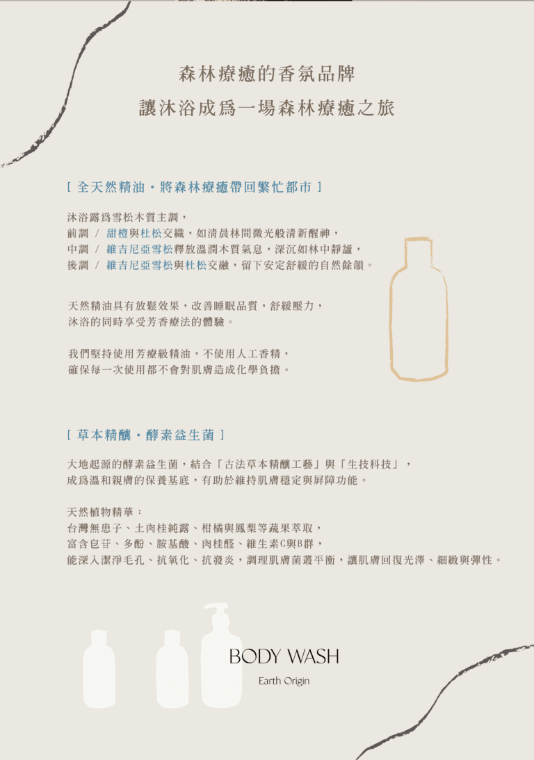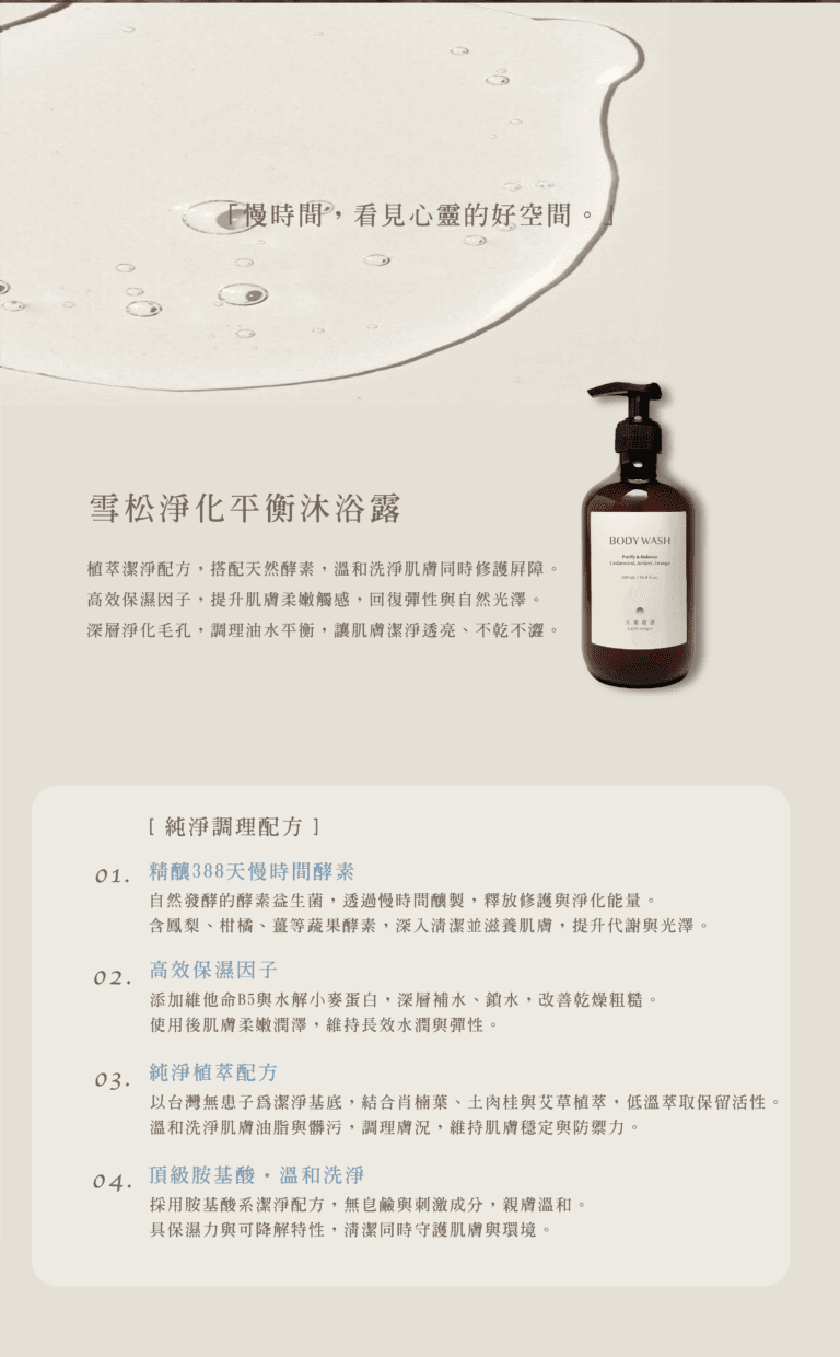 天然草本植萃精華,溫和潔淨,讓每一次沐浴成為一場放鬆儀式。