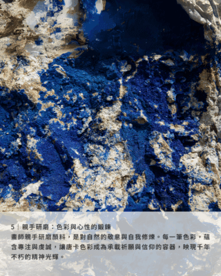 經過數小時的研磨與手感調整,那一抹藍色蘊含著畫師手中的力道與心中的靜定。這種專注與虔誠,使顏料不僅是色彩,更成為承載祈願與信仰的容器。